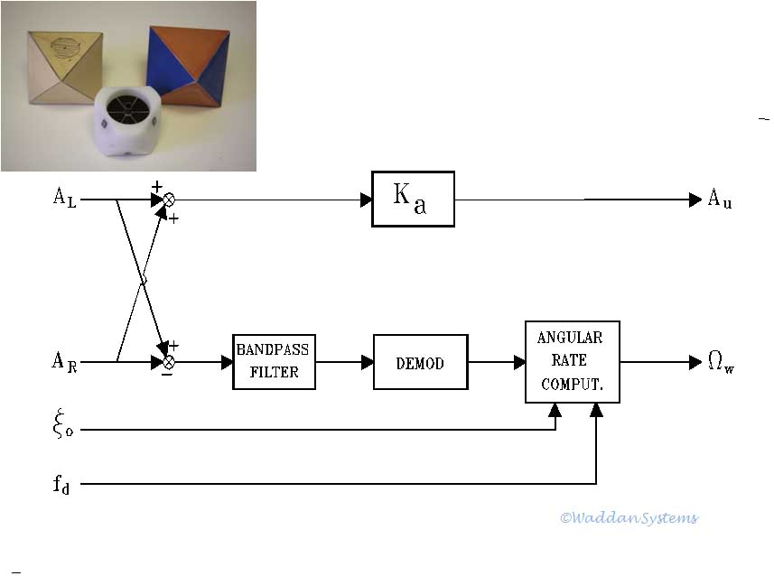 Waddan’s first IMU was made prior to its gyro sensor development. It employs three pairs of WISAs. The devices paired are dithered with equal but opposite side slip velocity. Thus, each device experiences linear as well as coriolis acceleration. Upon summing and differencing the outputs of a matched pair, the linear acceleration and angular rates are separated. The evolution and the principle of operation of the dither block IMU are illustrated in the pictures above. As dictated by the mathematical computations, the input axes of each pair of accelerometers have to be coincident. Moreover, in the 3D block, the three accelerometer-pair axes have to pass through a common origin.
