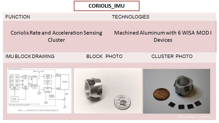A first use of WISA devices-Inertial Measurement Unit (IMU)-employed three pairs of accelerometers. Devices in each pair were configured to produce equal but opposite coriolis acceleration when subjected to an angular rate input. Summing their outputs yields the linear acceleration, and differencing yields the angular rate.
